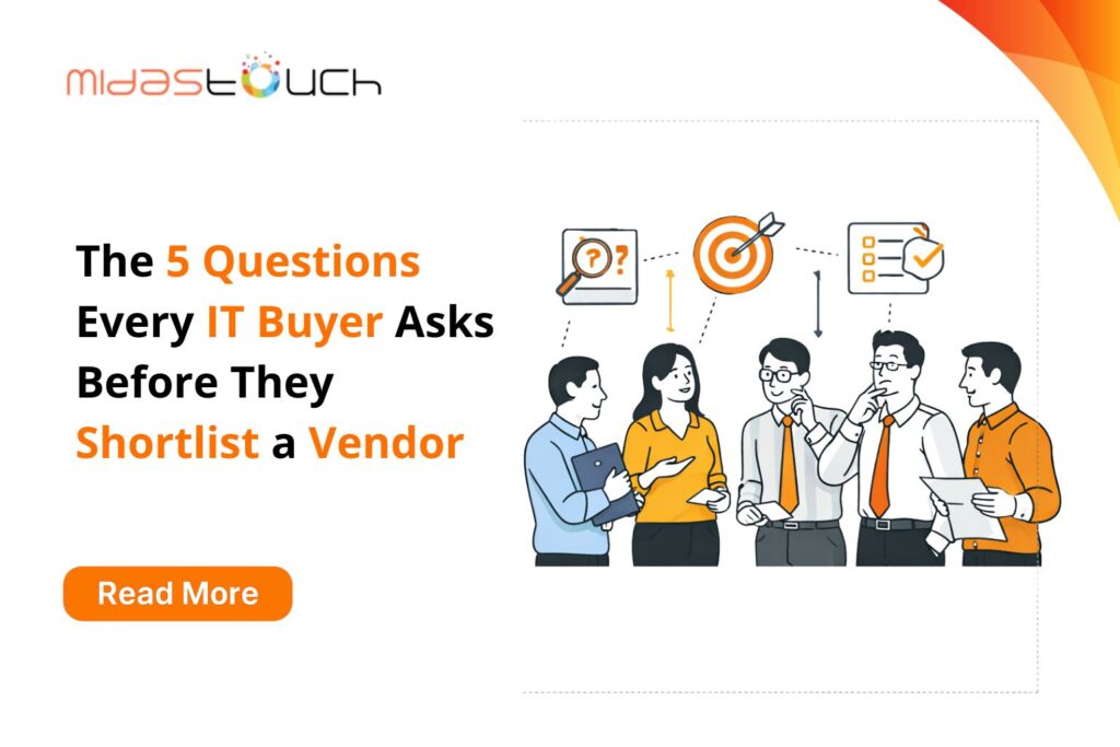 Let’s look at a typical scenario in IT sales. A potential buyer is evaluating vendors for a significant engagement. Your company is on the initial list – maybe through a referral, maybe through a LinkedIn search, maybe because someone in their team came across your content. The buyer’s team spends 20 to 30 minutes researching you online. They look at your website, check your LinkedIn, and read whatever they can find about you. And then they decide to move on. They don’t share a specific “feedback” or email with you. The result? Your company never even made it to the conversation stage. What happened in those 20 to 30 minutes? What were they looking for? What did they not find? In our experience at Midas Touch, working with 250+ IT services companies, the answer mostly traces back to five questions. These are the questions every serious IT buyer asks before they decide whether a vendor is worth a conversation. They may not always ask them out loud, but they are always looking for the answers. Question 1: “Have You Done This Before for Someone Like Me?” Before a buyer thinks about your team size, your technology capabilities, or your pricing, they want to know one thing: have you solved this specific problem for a company that looks like mine? Not a similar problem or a related engagement in a different industry. This specific problem, for this type of company, and with measurable results. This is why generic positioning tends to damage IT services companies. When your website says “we help enterprises with digital transformation,” you are speaking to everyone and convincing no one. If the buyer reading your website is a CFO at a mid-size manufacturing company looking for a partner to modernise their ERP, they are not looking for a company that does everything for everyone. They are looking for a company that has clearly done this before for someone like them. The companies that consistently make shortlists are the ones that have documented proof -real case studies with named problems, specific approaches, and real outcomes. Not vague testimonials. Not client logo strips without context. So, ask yourself honestly: If an IT buyer in your target segment visited your website right now, would they find a clear answer to “have you done this before for someone like me?” If the answer is no, that is the first thing to fix. Question 2: “Can I Trust These People?” Shortlisting a vendor is a professional risk. The person championing a vendor internally is putting their judgment and their reputation on the line. If the engagement goes wrong, they will answer for it. So before a buyer goes to bat for you internally, they are looking for trust signals. And trust in B2B is not built through advertising or clever messaging. It is built through evidence of consistent, credible expertise over time. What does that evidence look like in practice? It is the founder who posts regularly on LinkedIn with genuine insights. They don’t care so much about promotional content or shared articles. They look for original perspectives on problems their buyers are actually grappling with. It is the company blog that publishes educational content that helps buyers think more clearly, even if they never hire you. It is the case study that is honest about what was difficult, not just what went well. The question a buyer is asking is not “Does this company seem trustworthy?” The question is “Can I find enough evidence of their competence and integrity to justify recommending them to my leadership team?” Question 3: “Are They Talking to the Right People in My Company?” As we know, the average B2B technology purchase involves 13 people across the organisation. The IT Head who is evaluating you has peers, a CFO, business unit leaders, and a management team who will all form views about your company. When your positioning, your content, and your proposals speak only to the technical decision maker, the other twelve stakeholders in the buying group have nothing from you to work with. Buyers shortlist vendors whose communication is mature enough to speak to multiple audiences. The CFO needs to understand the business case. The procurement team needs to understand your vendor credentials and stability. The business unit leader needs to understand the implementation impact. When your company’s public presence – website, content, LinkedIn only speaks the language of IT, you are leaving the rest of the buying group to form their own impressions without your input. The best IT services companies we have worked with understand this instinctively. Their case studies have a business outcomes section, not just a technical summary. Their founder’s LinkedIn content occasionally addresses business leaders, not just technologists. Their website has a page or a section that speaks to the business value of what they do, not just the technical features. It is a small shift in perspective. The impact on shortlisting is significant. Question 4: “What Makes Them Different From the Other Five Vendors I Am Looking At?” Think about what a buyer sees when they research five IT services vendors in a single afternoon. Five websites that all say cloud, digital transformation, cybersecurity, agile delivery, customer-centric. Five LinkedIn company pages with similar follower counts and similar content. Five “About Us” pages with nearly identical language about passionate teams and innovative solutions. How do they choose? Often, they default to the vendor they have heard of most, the one with the most recognisable client names, or the one that a peer recommended most strongly. In other words, whoever has the strongest market presence wins. Differentiation in IT services is genuinely hard. But it is not impossible. The companies that answer this question well have usually done one of three things. All these things are a result of deliberate positioning decisions, sustained over time. Question 5: “What H